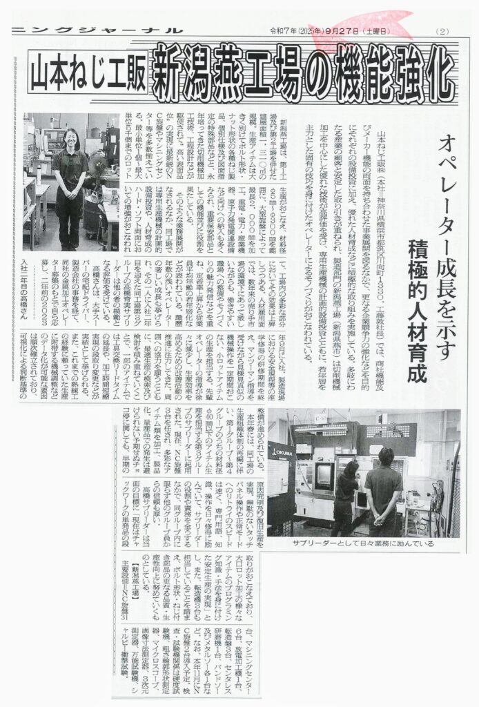 【工場】業界紙「ファスニングジャーナル」で新潟燕工場の取り組みが紹介されました! 2025年11月10日 2025年11月11日 ねじ業界の専門紙「ファスニングジャーナル」2025年9月27日号に、新潟燕工場の人材育成に関する取り組みについての記事が掲載されました。